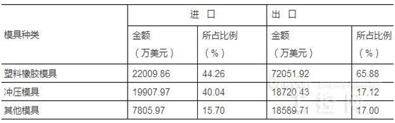 1. 按塑胶模具种类分,塑料橡胶模具进出口额占比为44.26%和65.88%;冲压模具为40.04%和17.12%,如表所示。